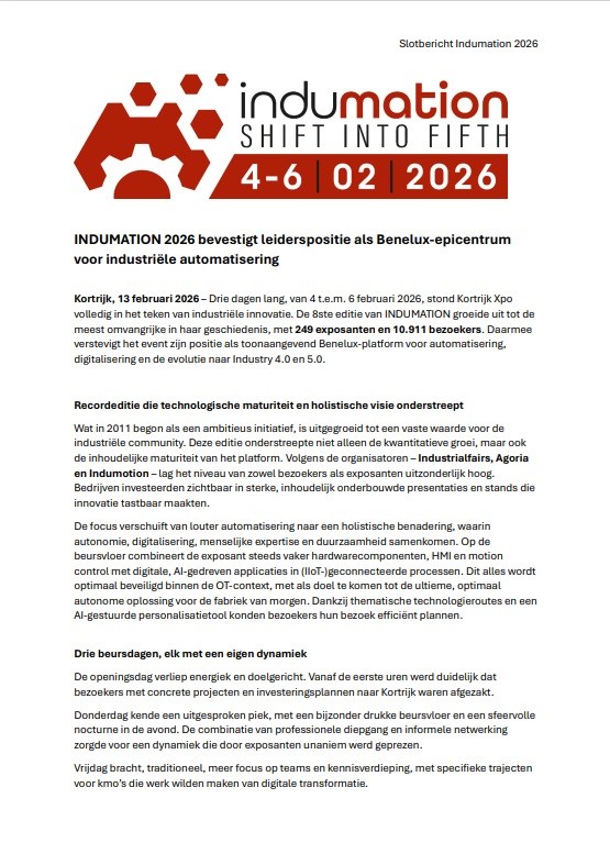 At the end of last week, Industrialfairs (the organiser of Indumation.be, Machineering, INE, ABISS and Prototyping-MNE), together with the leading technology companies represented in the federations Agoria and InduMotion, have jointly decided…