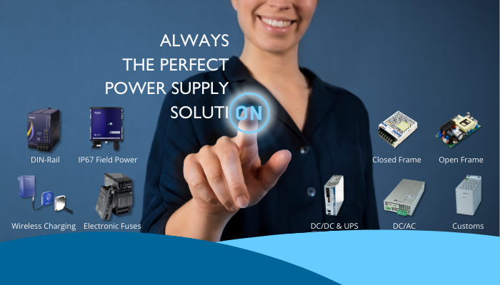 AC/DC voedingen, DC/DC converters, UPS & battery charging, DC/AC inverters, electronic fuses, wireless charging, IP67 field power supplies, open/closed frame modules én volledig maatwerk.